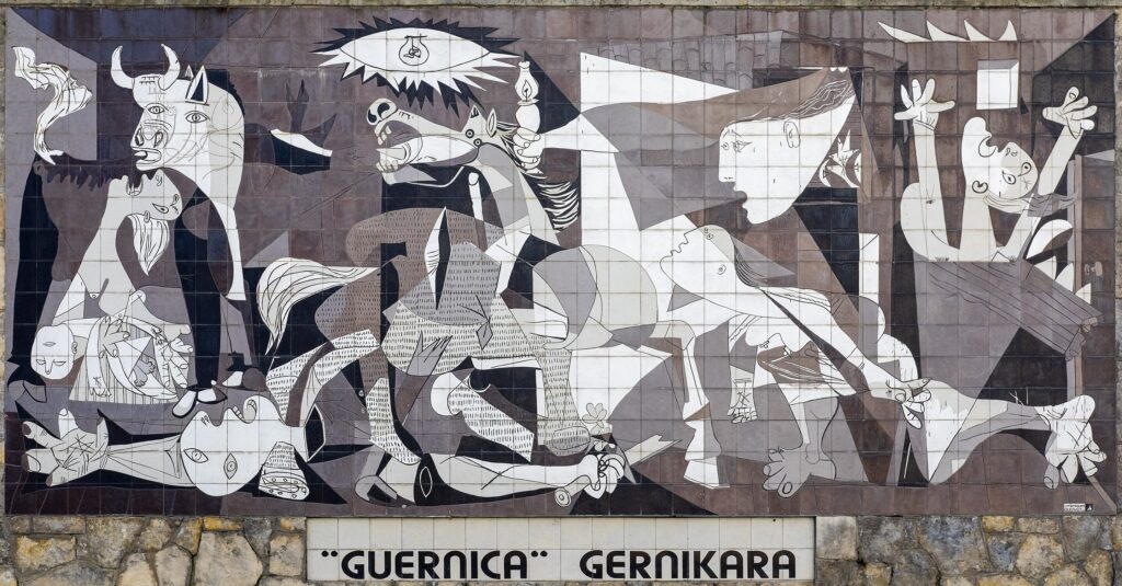 Jedno z najbardziej znanych dzieł XX wieku. Obraz przedstawia cierpienie i chaos spowodowane bombardowaniem baskijskiego miasteczka Guernica podczas wojny domowej w Hiszpanii.